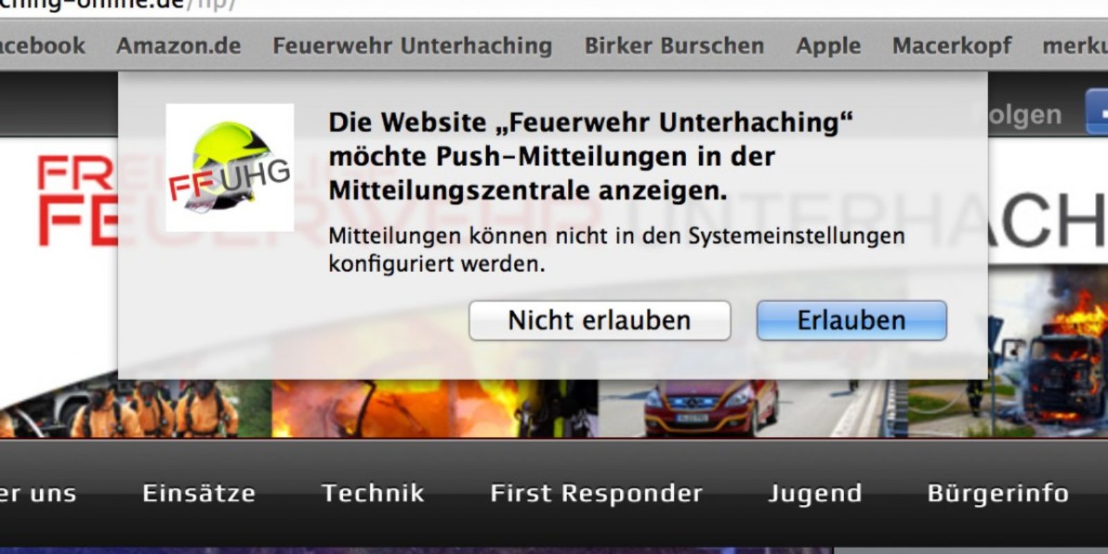 Seit OS X 10.9 Mavericks besteht auf dem Mac die Möglichkeit Push-Benachrichtigungen von Webseiten zu erhalten. Auch die Feuerwehr Unterhaching bietet ab jetzt diesen Service, mit dem Sie immer auf dem Laufenden gehalten werden, was es Neues bei uns gibt.